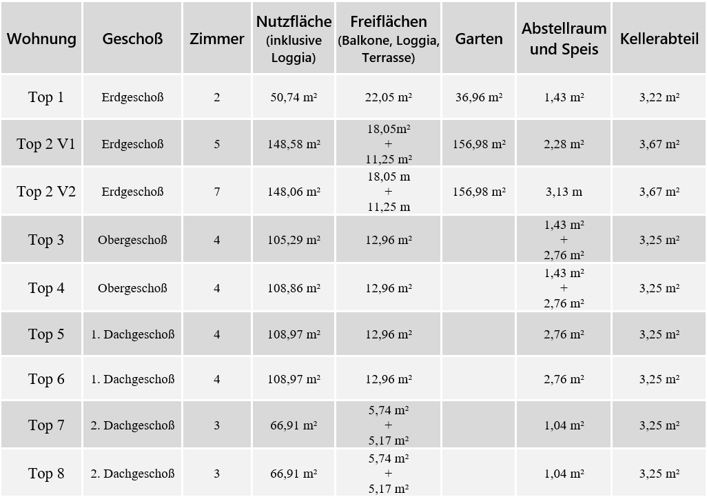 Es wird eine 4-geschoßige Wohnhausanlage mit 8 Wohnungen und einer Teilunterkellerung errichtet. Im Untergeschoß befinden sich der Haustechnikraum sowie ein Raum zum Abstellen von Fahrrädern und Kinderwägen und den 8 Kellerabteilen. Über ein zentrales Stiegenhaus mit Aufzug sind sämtliche Geschoße barrierefrei erreichbar. Die Wohneinheiten im Erdgeschoß verfügen über einen Eigengarten inklusive großzügiger Terrassen. In den anderen Geschoßen verfügen alle Wohnungen über Freiflächen (Balkon oder Terrasse). Durch die Ausrichtung sämtlicher Wohnungen nach Osten und Westen in Kombination mit raumhohen Fenstern wird ein hoher Tageslichtanteil ermöglicht.